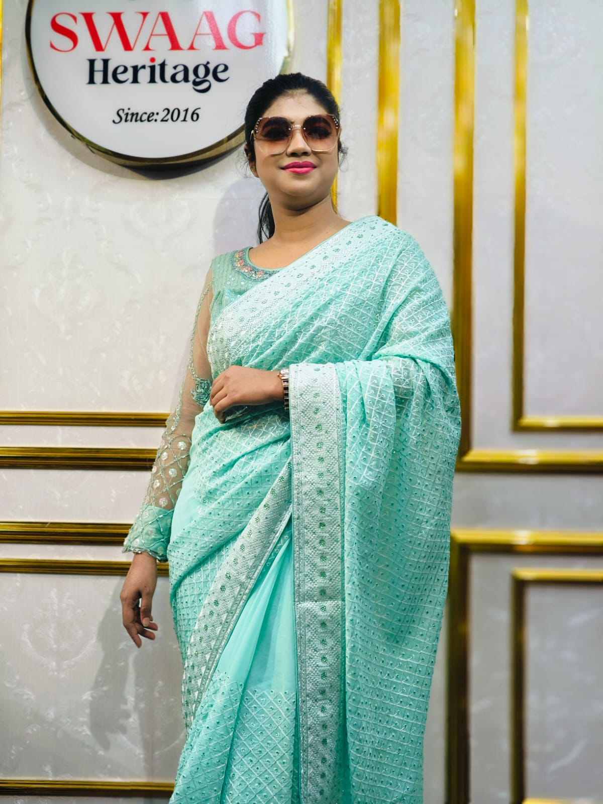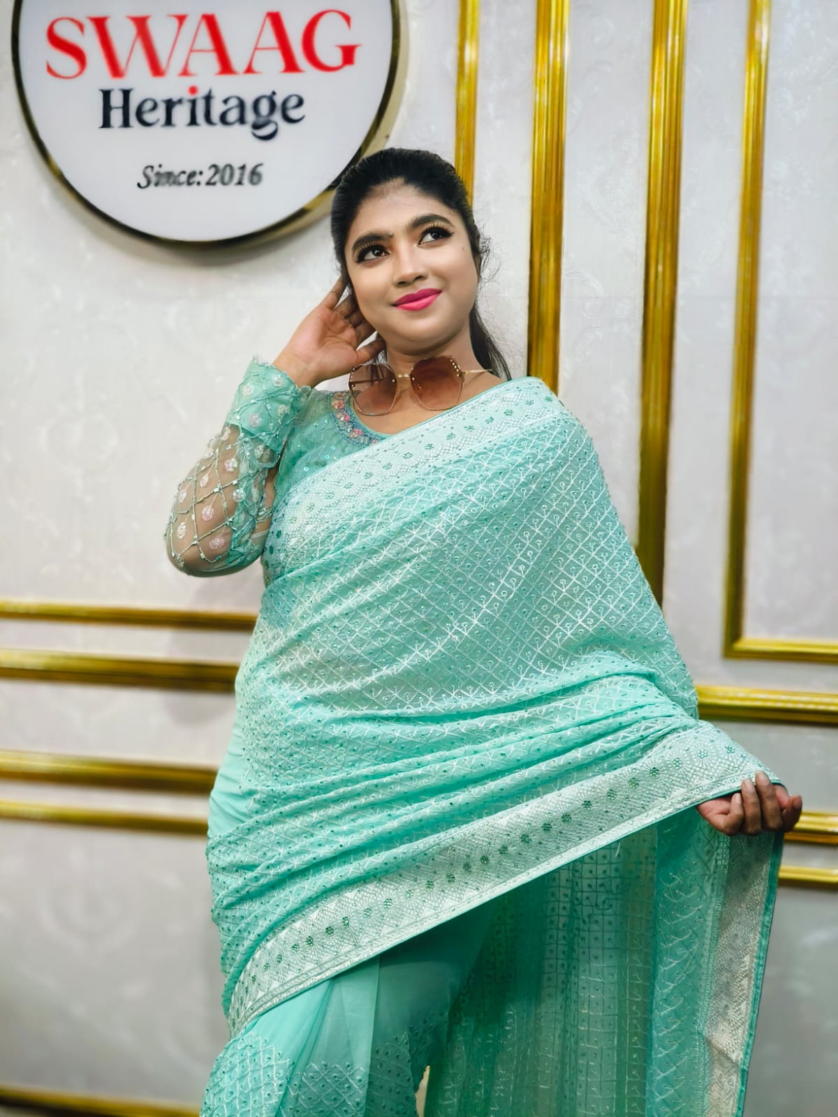 Elevate your party look with this beautifully crafted Soft chiffon Georgette Aqua blue Party Wear Saree, designed for women who love effortless elegance with a touch of glamour. The fabric’s natural flow, lightweight texture, and smooth drape make it perfect for evening events and festive celebrations. Subtle shine and intricate detailing add a stylish charm that stands out without being overwhelming.