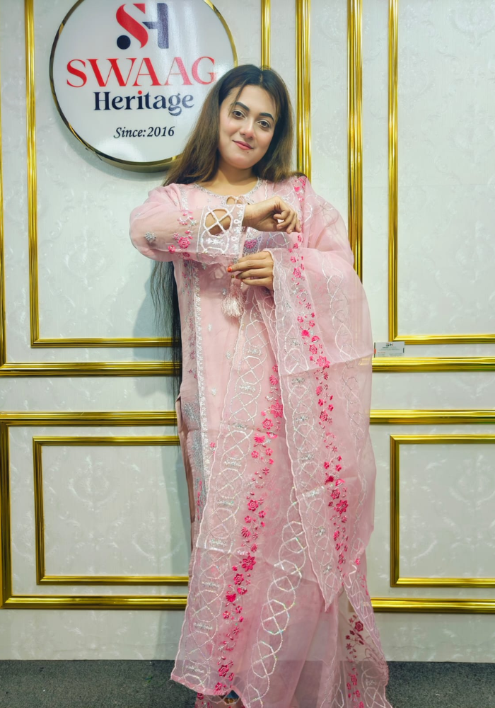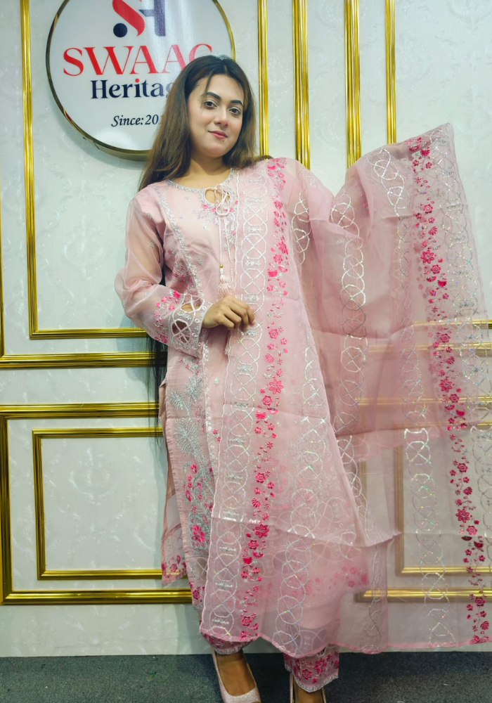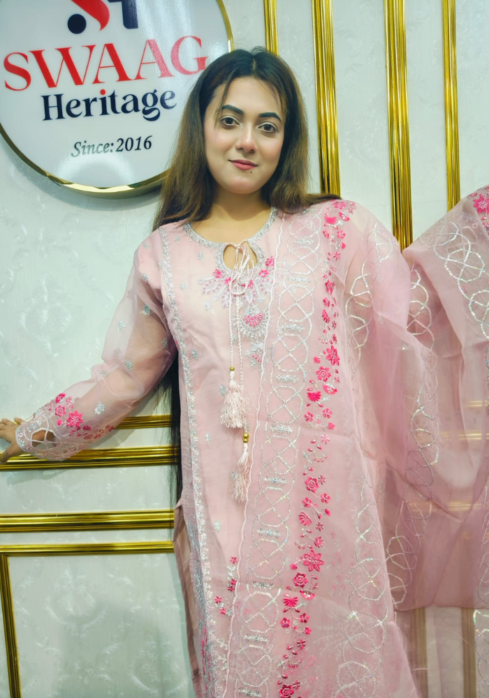 Embrace timeless elegance with this Soft Embroidered premium-quality organza 3 Piece Dress from SWAAG Heritage. Crafted from premium organza -fabric, this ensemble features delicate Embroidery that enhances its graceful appeal.