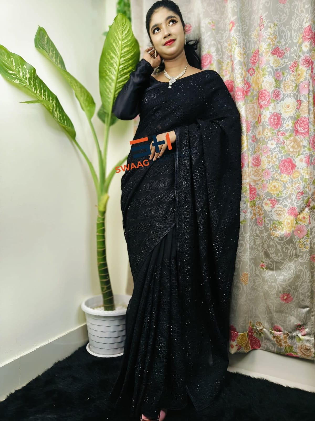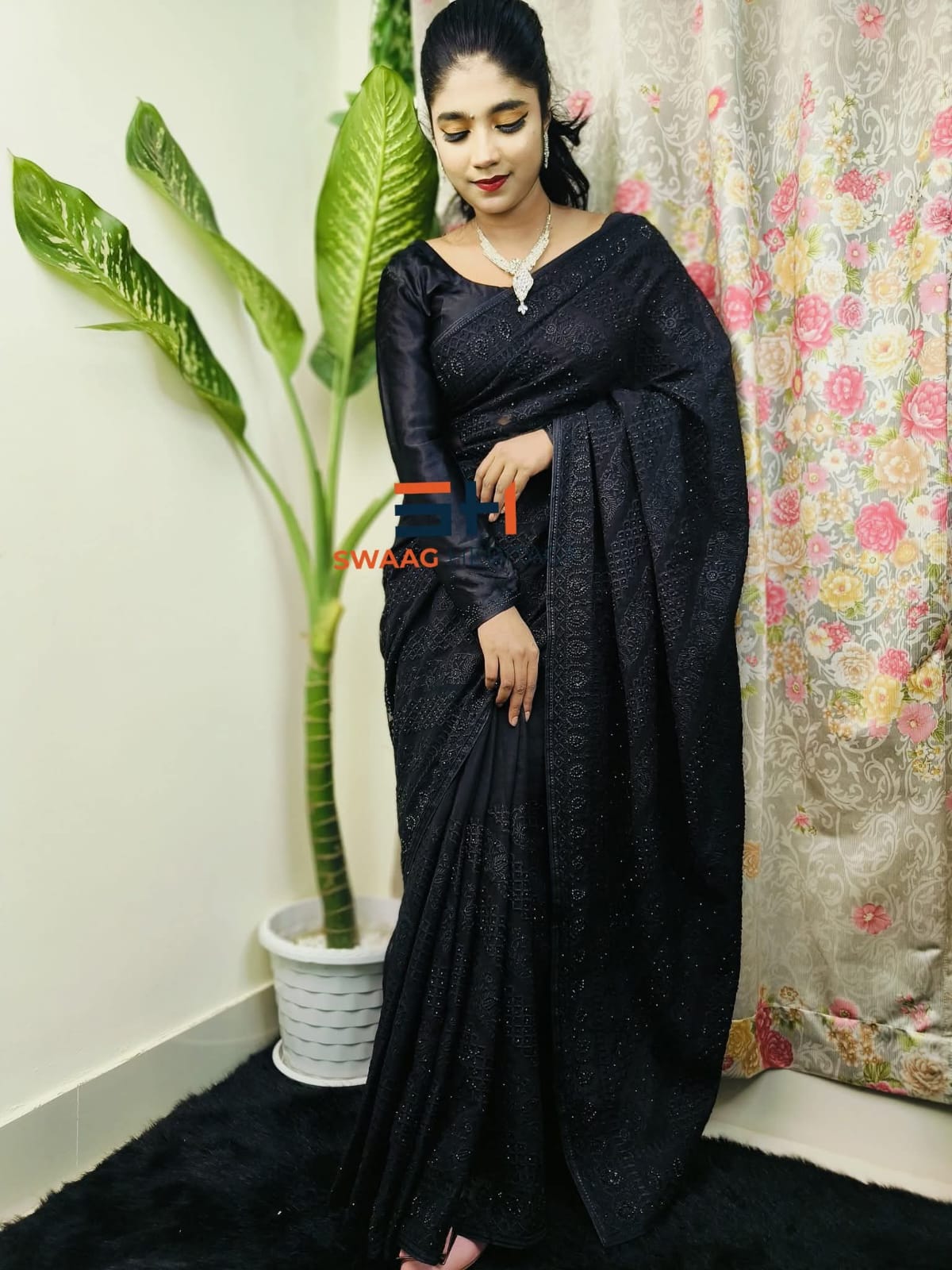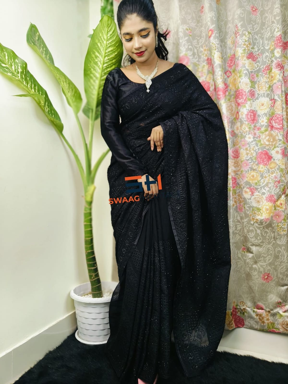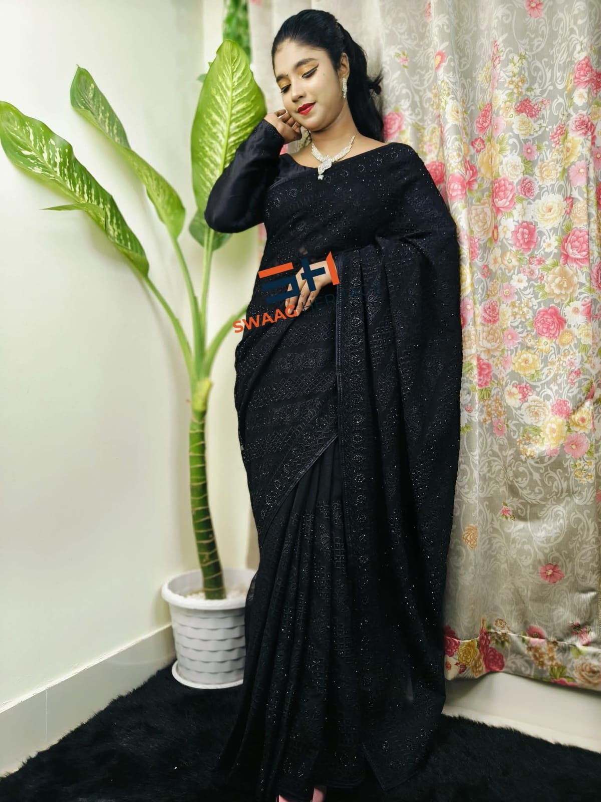 Black Soft Georgette Premium Party Wear Saree – Barish Embroidery & Real Stone Work