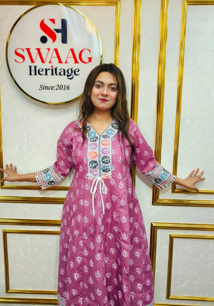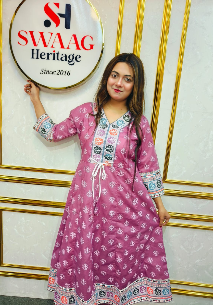 Paired with a matching bottom, this pure cotton Anarkali set is perfect for casual wear, festive occasions, and semi-formal events. Lightweight and stylish, it flatters all body types while ensuring ease of movement and a polished appearance.