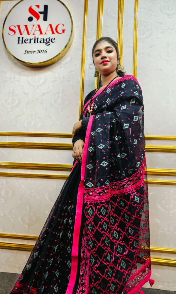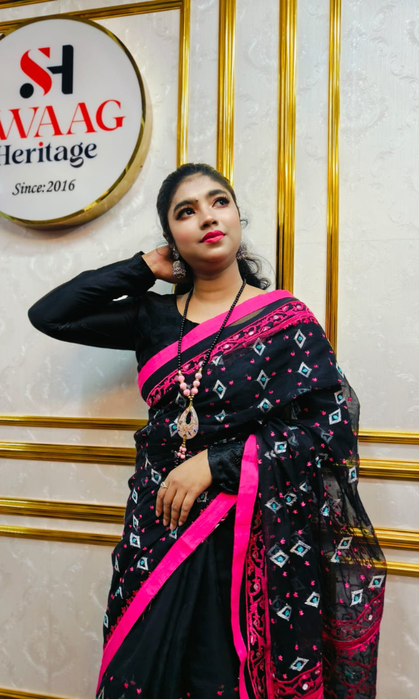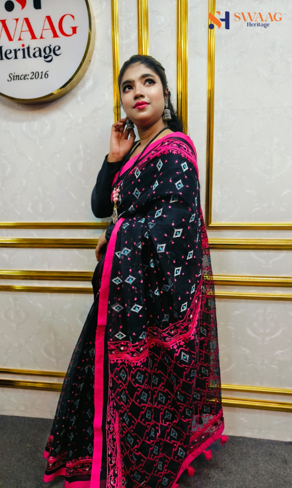 From SWAAG Heritage, this soft muslin handloom saree celebrates the timeless beauty of Jamdani motifs. Crafted with meticulous care, it features all-over matching thread embroidery enriched with delicate silver zari thread work. The refined motifs and graceful drape reflect heritage craftsmanship blended with modern elegance. Lightweight, breathable, and luxurious, this saree is perfect for festive occasions, boutique collections, and sophisticated celebrations.