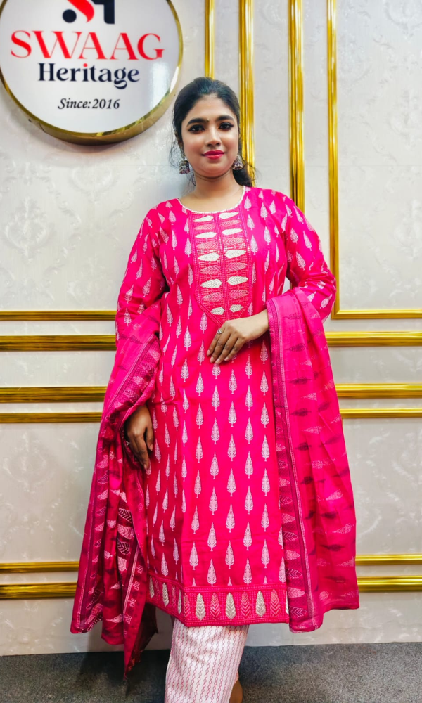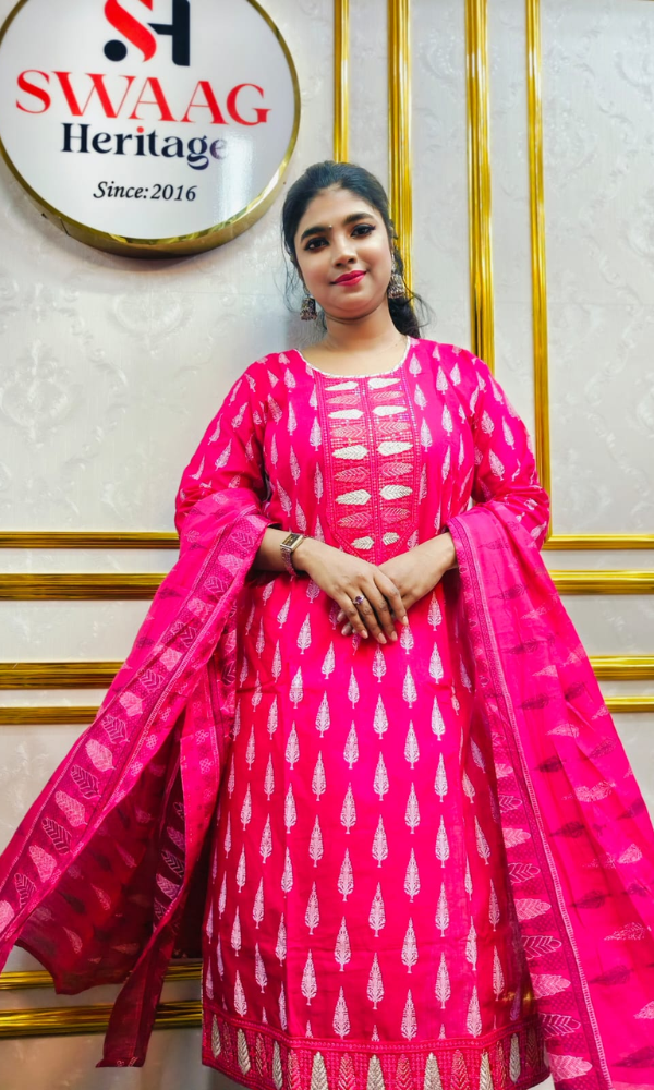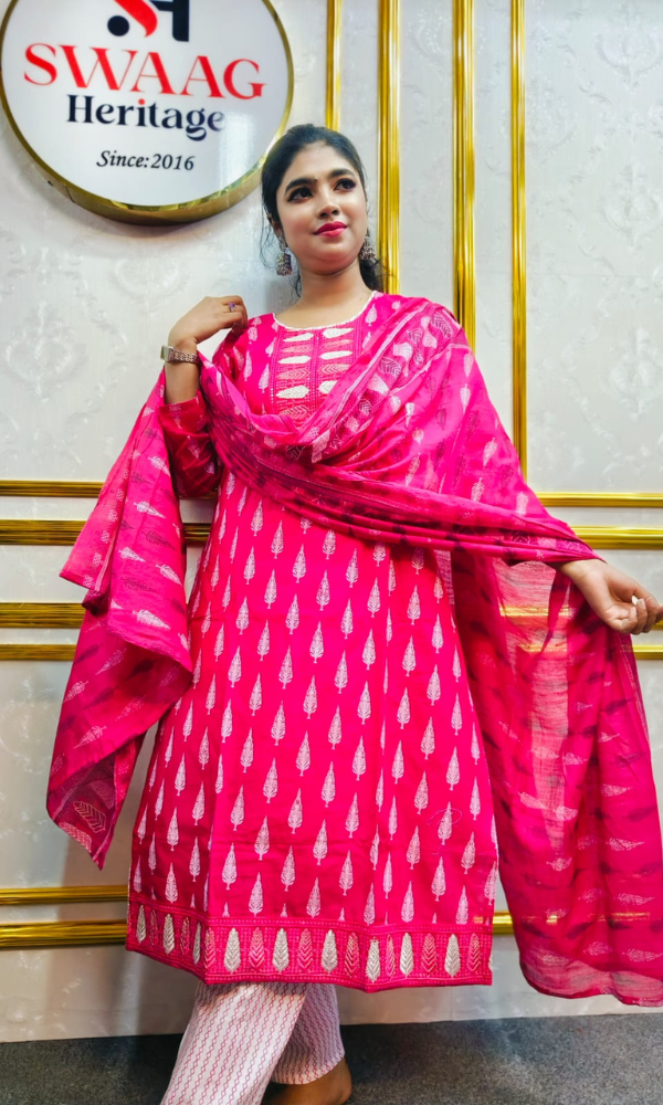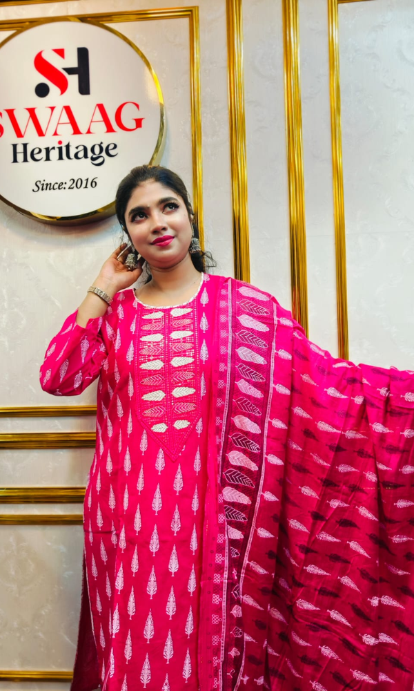 Paired with a coordinated pure cotton dupatta, this ensemble is perfect for festive wear, cultural gatherings, office events, and daytime celebrations. A true blend of heritage craftsmanship and contemporary boutique style.