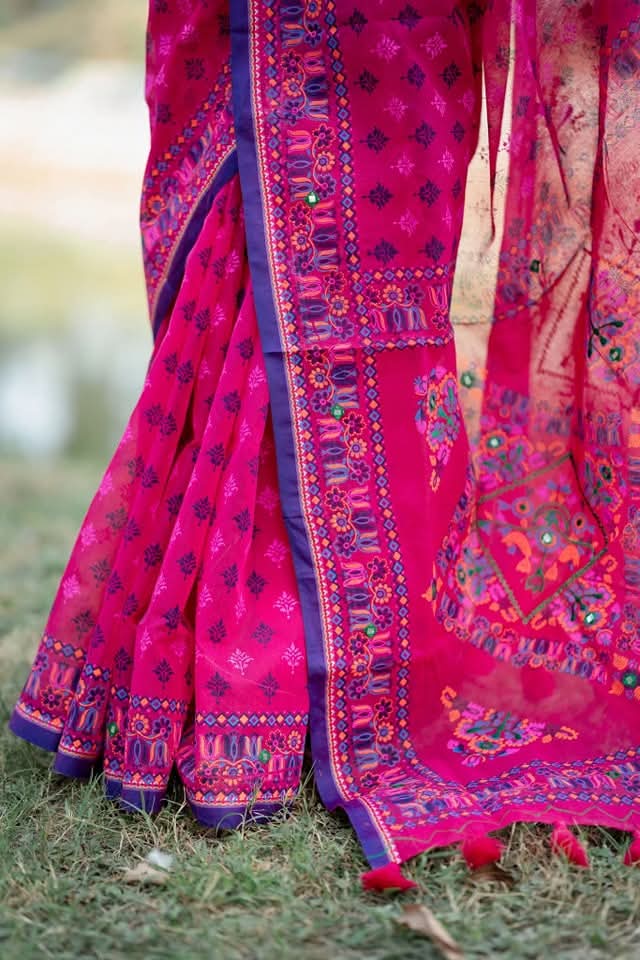 The rich Magenta tone paired with vibrant multicolor ethnic motifs creates a stunning visual appeal. Its intricate printed patterns and contrasting border add a festive charm, making it perfect for both casual and special occasions.
