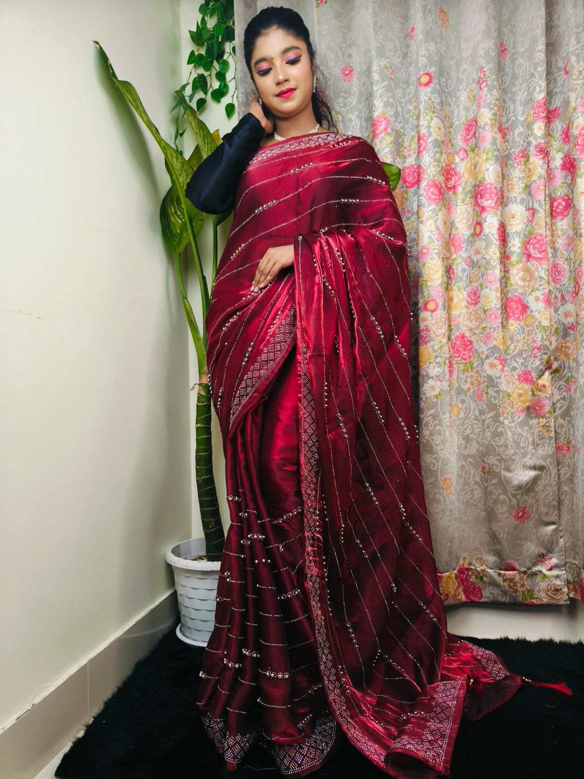 Elevate your party look with this beautifully crafted zimmi chu Maroon Party Wear Saree, designed for women who love effortless elegance with a touch of glamour. The fabric’s natural flow, lightweight texture, and smooth drape make it perfect for evening events and festive celebrations. Subtle shine and intricate detailing add a stylish charm that stands out without being overwhelming.