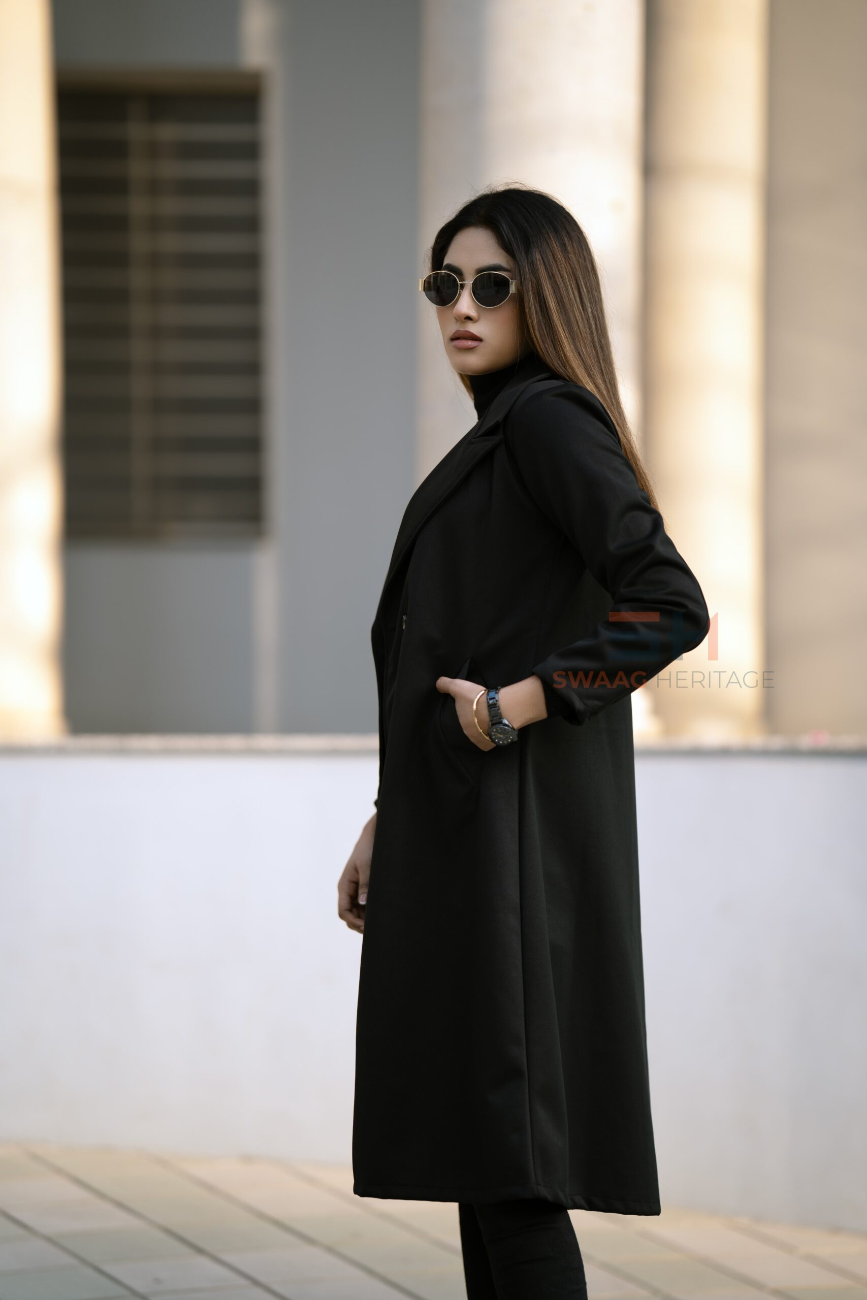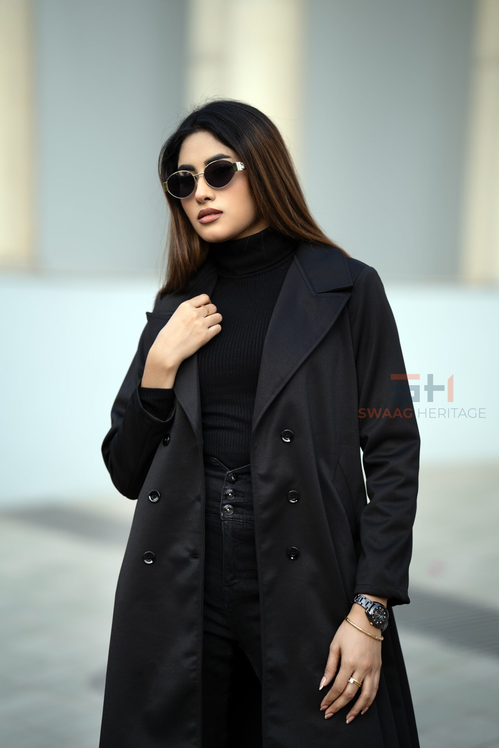 Step into timeless elegance with the SWAAG HERITAGE Premium Black Double-Breasted Overcoat, tailored for those who embrace luxury with minimal effort. This longline coat features a gracefully structured lapel, smooth drape, and refined double-button design that elevates any outfit instantly.
