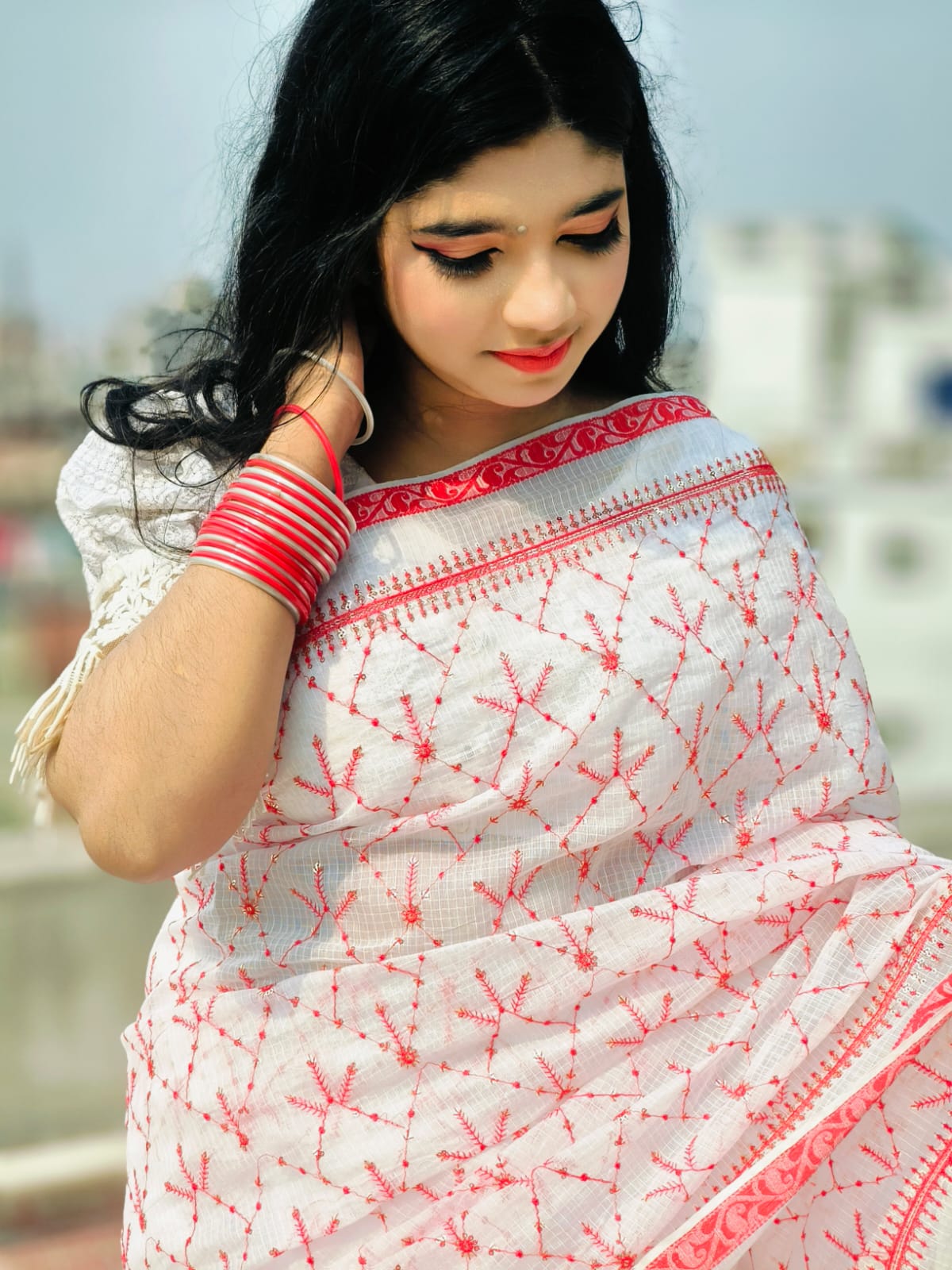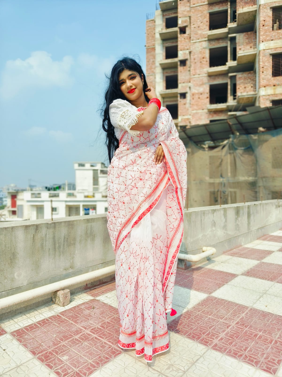 Pure Cotton white with Red contrast Saree with Elegant Sequins & Handloom Embroidery Work