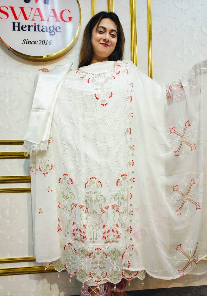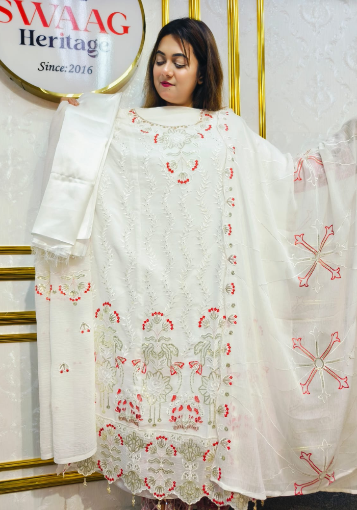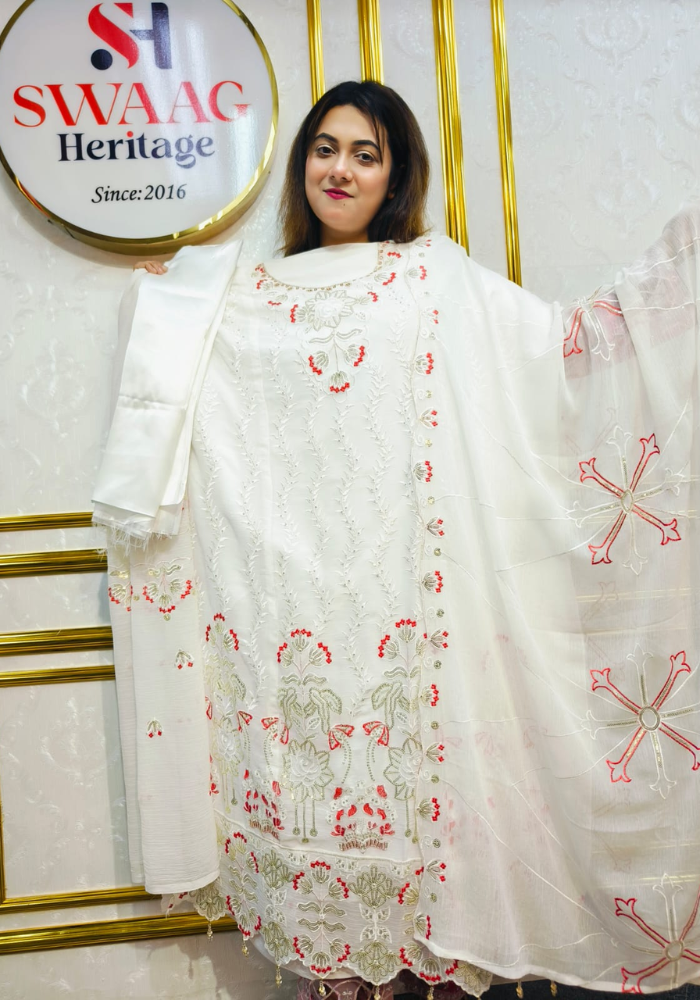 Embrace timeless elegance with this Soft Embroidered soft premium-quality chiffon 3 Piece Dress from SWAAG Heritage. Crafted from premium-chiffon Georgette fabric, this ensemble features delicate Embroidery that enhances its graceful appeal.