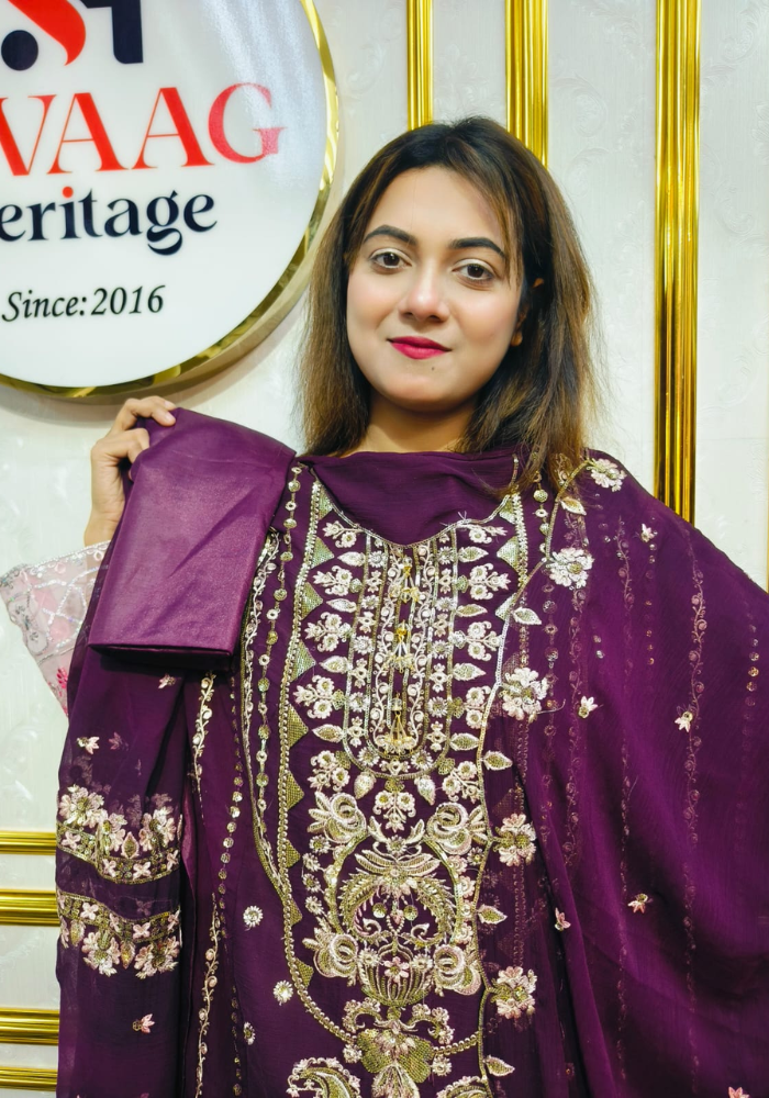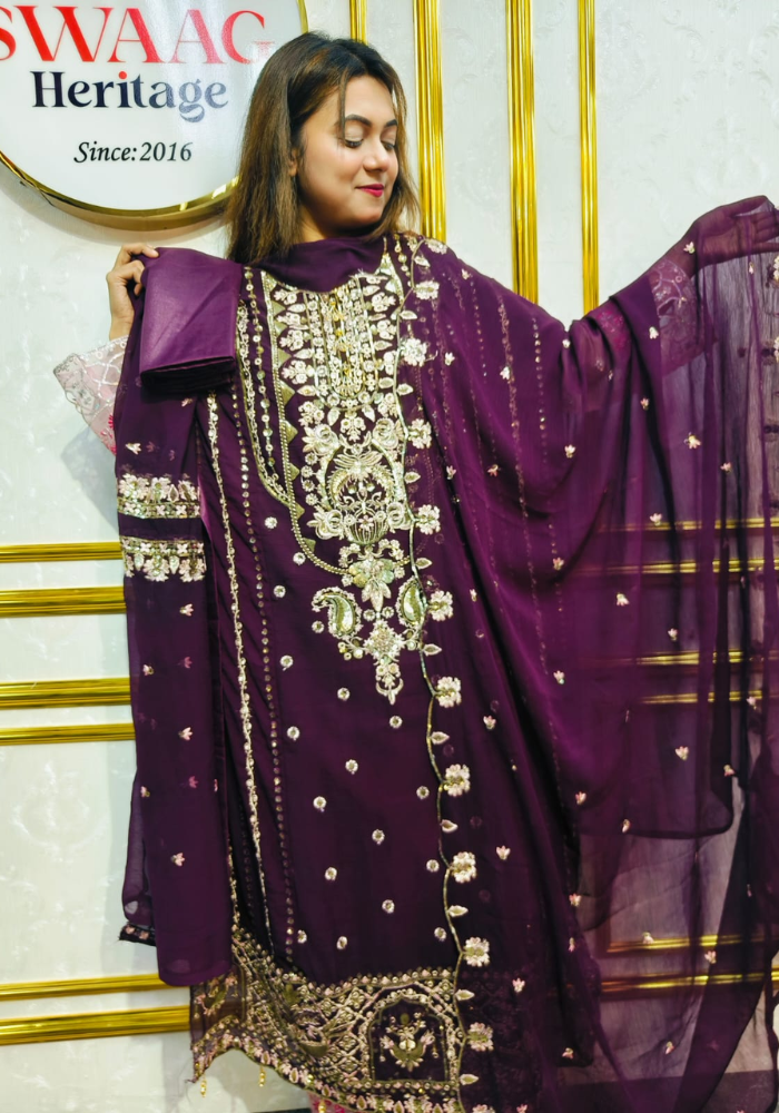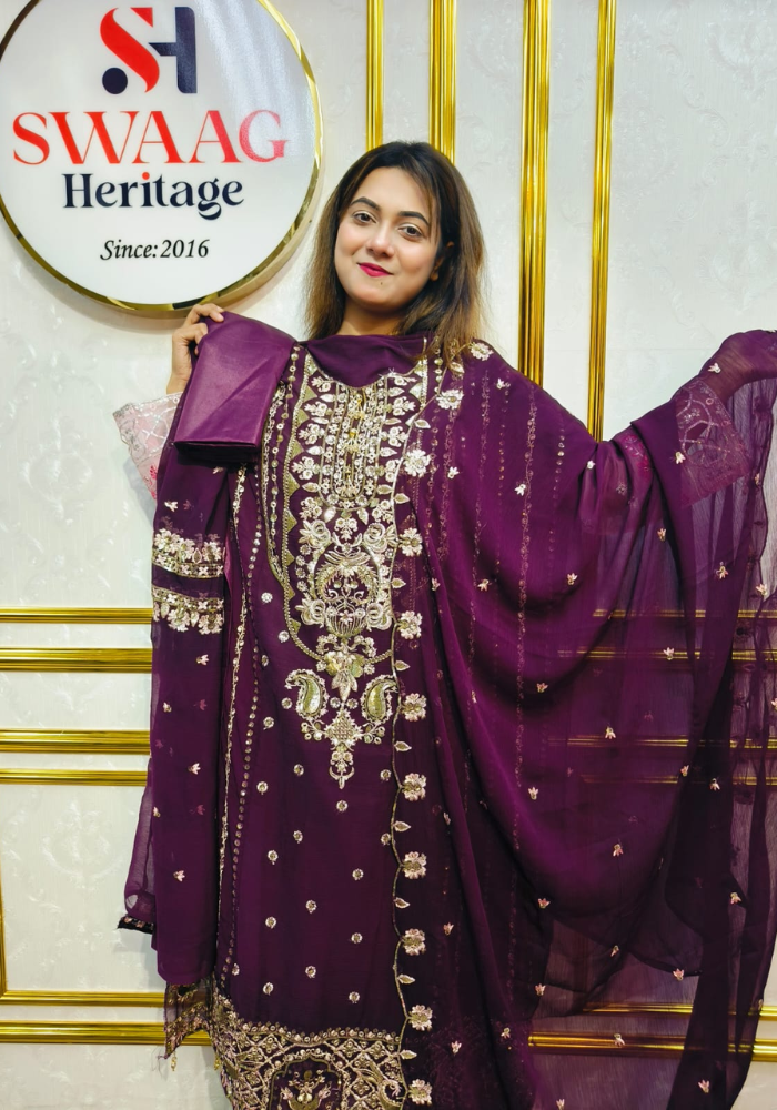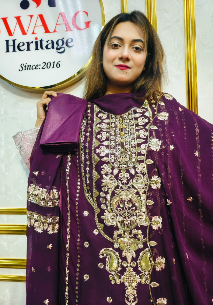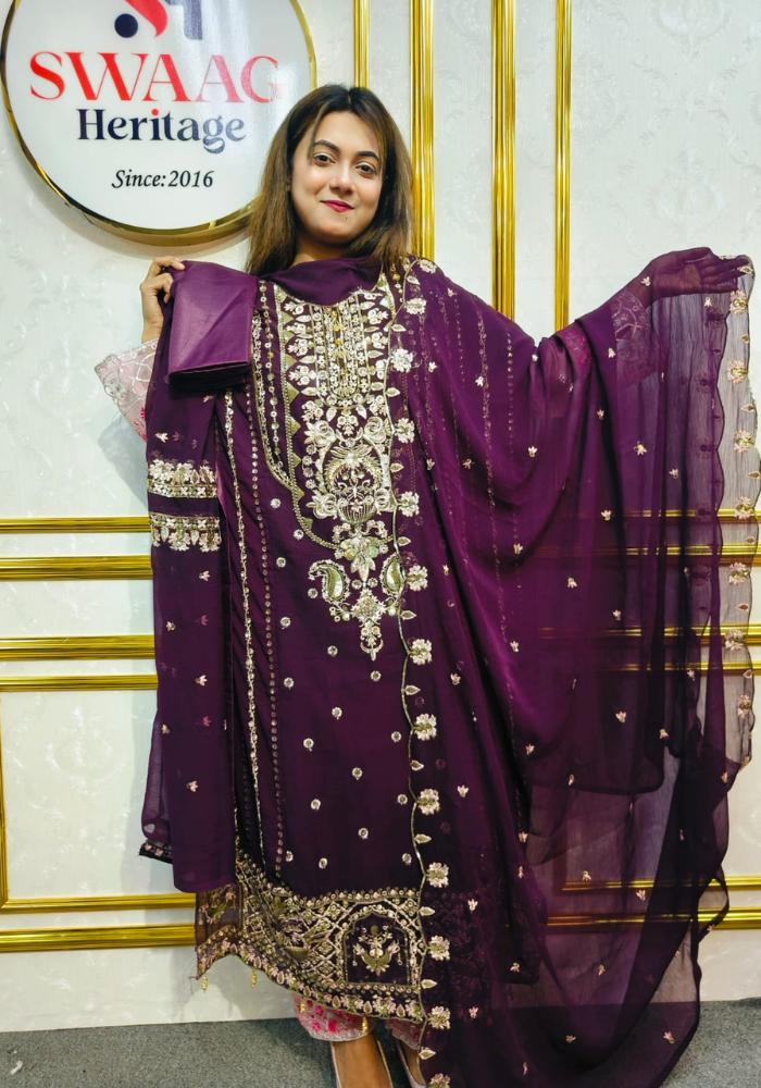 Embrace timeless elegance with this Soft Embroidered soft premium-quality chiffon 3 Piece Dress from SWAAG Heritage. Crafted from premium-chiffon fabric, this ensemble features delicate Gold & Green Embroidery that enhances its graceful appeal.
