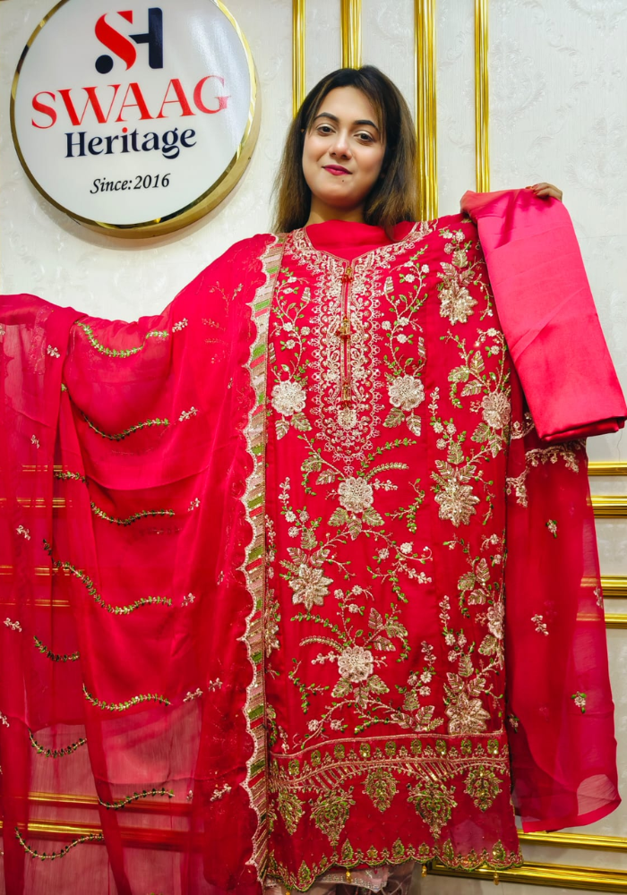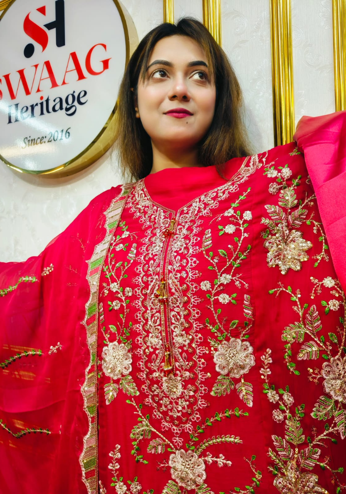 The beautifully Crimson Embroidered 3-Piece Unstitched Suit  showcases intricate work on the neckline and hem, adorned with subtle motifs throughout. It comes paired with a matching bottom and an exquisitely embroidered dupatta that adds fluidity and sophistication to the overall look.