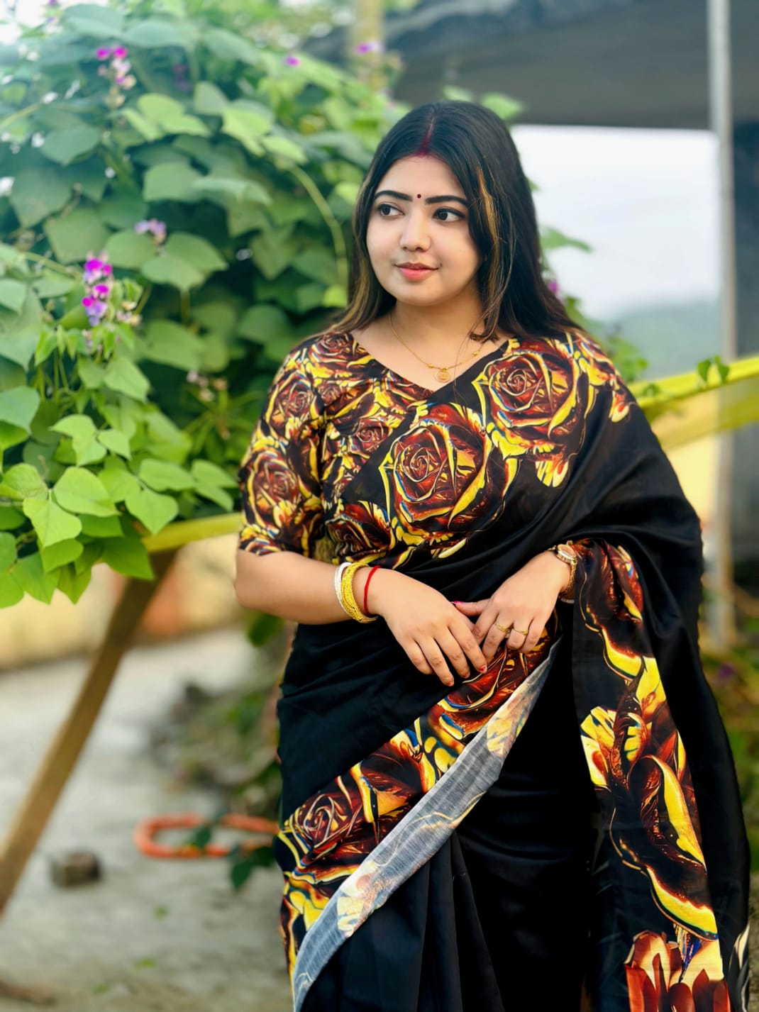 Elevate your ethnic wardrobe with this stunning Semi Silk Digital Printed Saree, designed to bring grace, comfort, and timeless elegance together. Crafted from soft semi-silk fabric, this saree features vibrant digital floral prints that enhance its sophisticated appeal. The lightweight drape flows beautifully, making it perfect for festive occasions, parties, cultural programs, or special photoshoots.